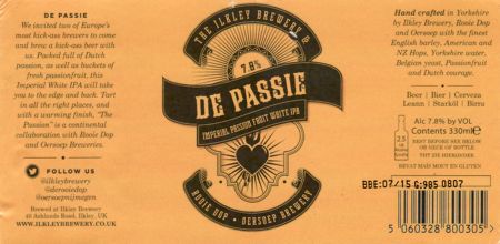 | DE PASSIE | ILKLEY BREWERY | INDIA PALE ALE | 7.8 | 0.330 |
